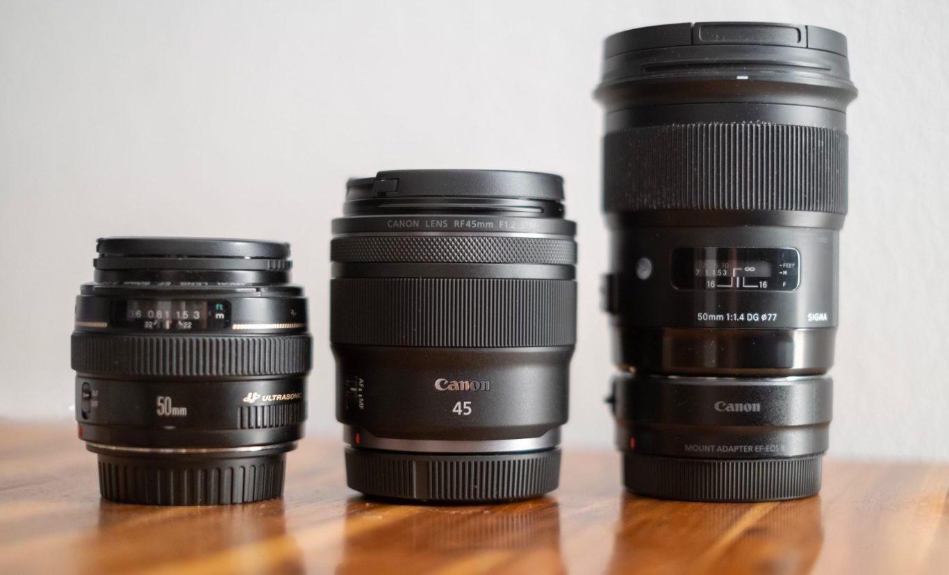 Größenvergleich: Canon EF 50 1,4 (v.li.), Canon RF 45 1,2 und Sigma 1,4 DG (mit RF-Adapter)